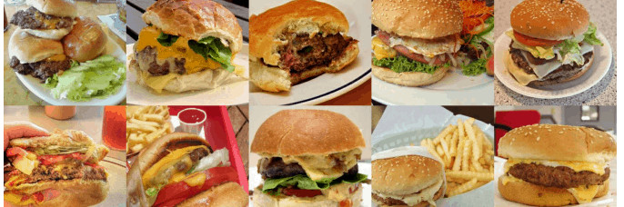 Een GAN-systeem bestaat uit twee concurrerende neurale netwerken die samen nieuwe realistische output genereert. Het eerste neurale netwerk is het discriminative network. Ofwel de discriminator. Om tot nieuwe output te komen, geef je dit netwerk een grote dataset met trainingsgegevens. In onderstaand voorbeeld foto’s van hamburgers. Het netwerk leert uit deze verzameling wat een foto van een hamburger is.